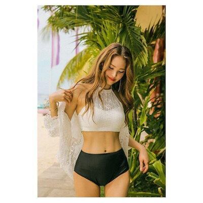 水着セット ックビキニレースレディース紐ハイウエストパッド付きワイヤー入り水着白黒2点セットホワイトMLXL