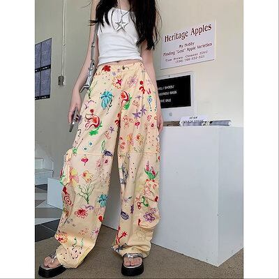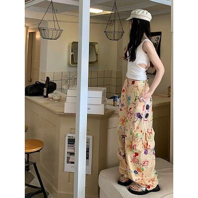 2025春夏 落書き風プリント モップパンツ ワイドパンツ カーゴパンツ ハイウエスト ルーズ ゆったり レトロ 韓国ファッション レディース