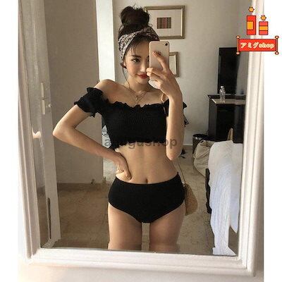 水着 レディース ビキニ オフショルダー セットアップ 2点セット ブラック フェミニン 可愛い