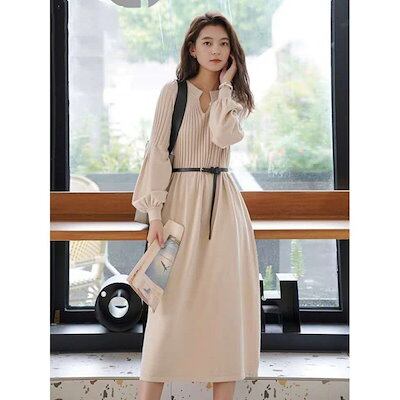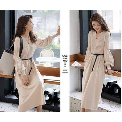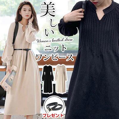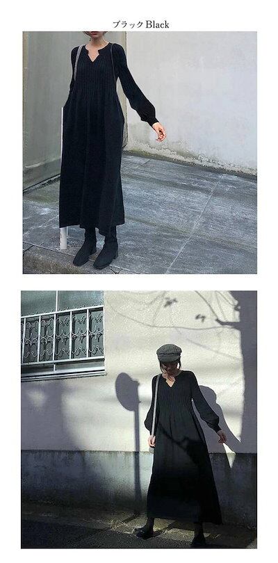 【即納】ニットワンピース レディース リブニットワンピース ニット ワンピース 秋冬 春 Vネック 長袖 ブラック きれいめ ハイウエスト ゆったり マタニティ ロング丈 マキシ丈 ロングワンピース