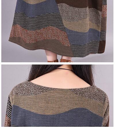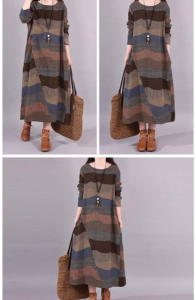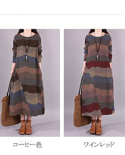 ロングワンピース 綿麻風 レディース カジュアル 春秋 ワンピース ロング丈 クルーネック 切り替え マキシワンピース マキシ丈 ボーダー柄 エスニック カシュクールワンピース 長袖 大きいサイズ シ