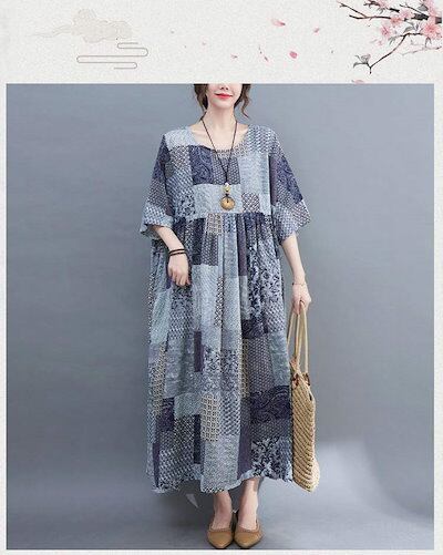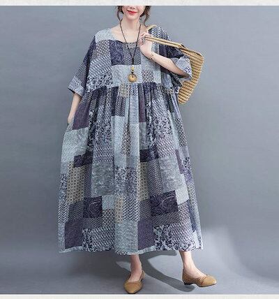 ワンピース レディース 春夏 ロングワンピース スクエア 切り替え 五分袖 フレアワンピース コットン フレンチスリーブ マキシ丈 綿麻ワンピース エスニック ワンピ リゾートワンピース プルオーバー