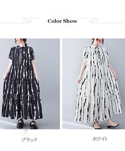 ロングワンピース 半袖 レディース シャツワンピース 大きいサイズ バンドカラー バルーン袖 フレアワンピース マキシ丈 カジュアル 体型カバー 着痩せ プリーツワンピース ボタン付き スタンドカラー