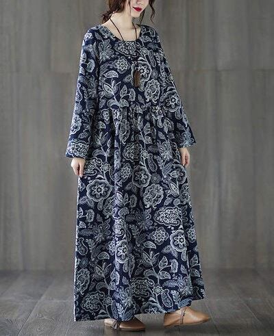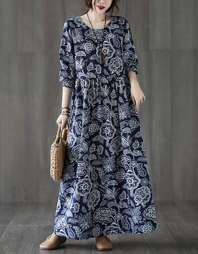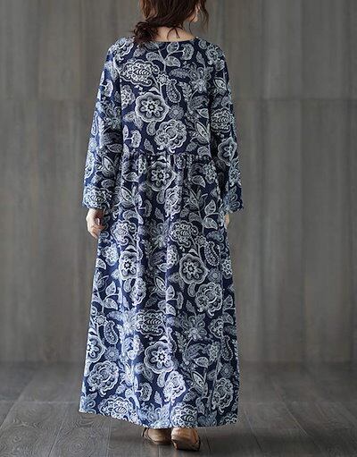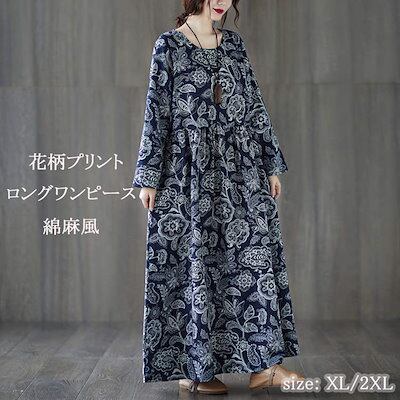 ロングワンピース レディース きれいめ ロング丈 ワンピース ラウンドネック 長袖 プリント 花柄 フレアワンピース ギャザー ふんわり Aライン 着痩せ マキシワンピース マキシ丈 フレア ボリュー