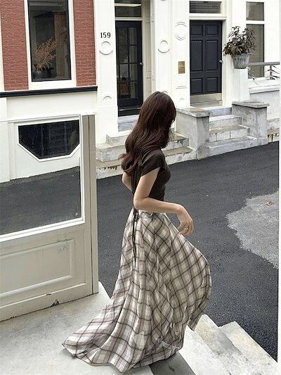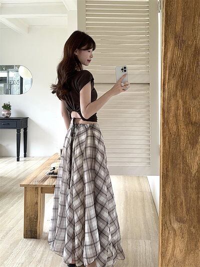 2点セット レディース ショートtシャツ フレアスカート 上下セット ロングスカート バックレス Aライン サーキュラー マキシ丈 チェック柄 セクシー y2k ギャル服