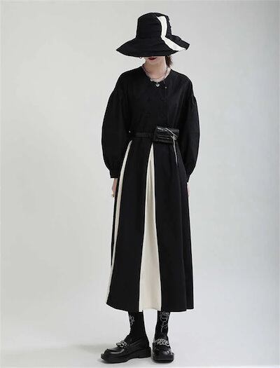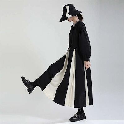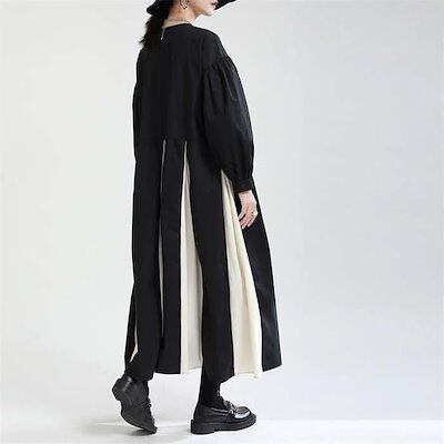 配色切替えワンピース ワンピース レディース 秋冬 ドッキングワンピース 綿 ロング 長袖 バルーン袖 モード系 クルーネック 切り替え 配色 マキシ丈ワンピ ロングワンピース 落ち感 ドレープ感 個