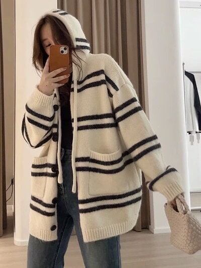 【 3日出荷 】カーディガン 2025 秋新韓国 ニットカーディガン ストライプ連帽ジップニット秋ニットカーディガンコート レディースファッション