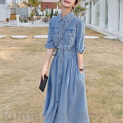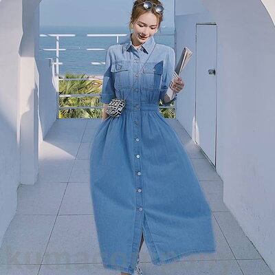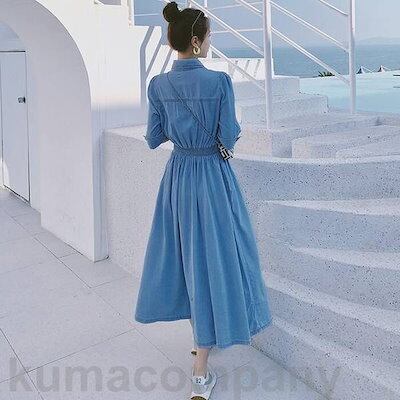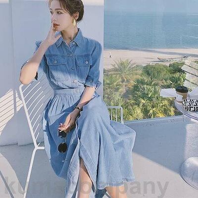 ワンピース ドレス デニム 袖あり シャツワンピ エレガント レディース きれいめ カジュアル おしゃれ 五分袖 大人 可愛い フェミニン ミモレ丈 シャツワンピ 体型カバー ウエストゴム シンプル
