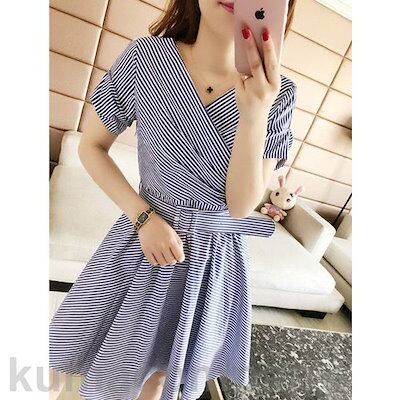 ワンピース ドレス 袖あり ストライプ ボーダー レディース きれいめ カジュアル おしゃれ 半袖 大人 可愛い フェミニン ショート丈 体型カバー ハイウエスト ウエストベルト Vネック ブルー 青