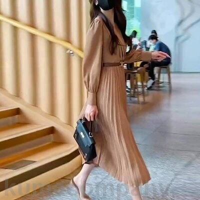 ワンピース ドレス 袖あり プリーツ エレガント レディース きれいめ カジュアル おしゃれ 長袖 大人 可愛い フェミニン ミモレ丈 体型カバー Vネック ウエストベルト ブラウン 春 秋 夏 20