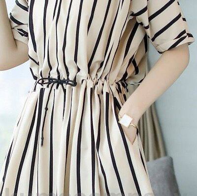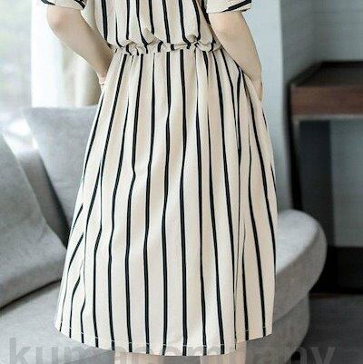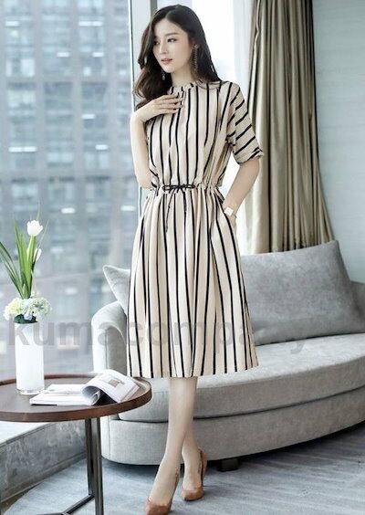 ストライプ ワンピース 半袖 膝丈 レディース シャツワンピース 五分袖 Aライン ウエストマーク スタンドカラー 大きいサイズ 3L 小さいサイズ 春夏 黒 韓国 ファッション 通勤服 オフィス カ