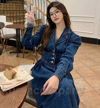 デニム ワンピース ロング ミモレ 長袖 ウエストマーク 襟付き 春 秋 Aライン フレア ロングワンピース レディース カジュアル おしゃれ 大きいサイズ 3L 4L 5L 韓国 ファッション 20
