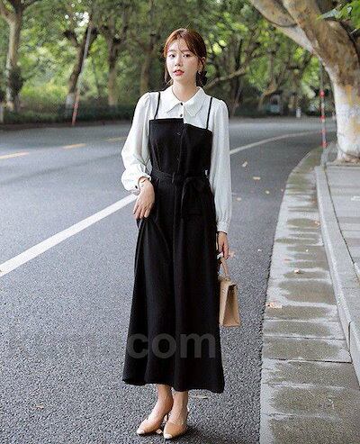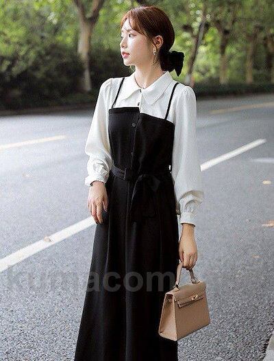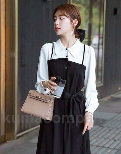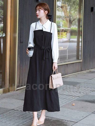 ドッキングワンピース レディース シャツワンピース ロング 長袖 ロングワンピース Aライン 春 秋 切り替えワンピース シンプル 大きいサイズ 黒 白 ウエストリボン ウエストマーク アシンメトリー