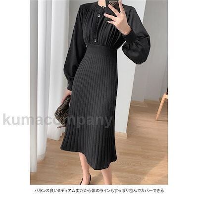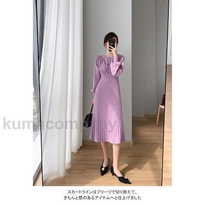ワンピース 長袖 ロングワンピ レディース マキシ丈 ニットワンピース aライン プリーツ クルーネック リブ袖口 ハイウェスト フェミニン 弾力 秋冬