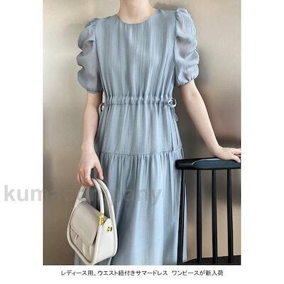ロングワンピース レディース フレアワンピース クルーネック 半袖 パフスリーブ ひざ下 バックボタン付き 裏地付き ウエスト紐付き プレゼント