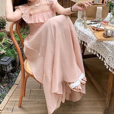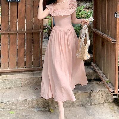 甘い 優しい ピンク プチスリーブ ワンピース レディース ピコットフリル スクエアネック ロングワンピース ウエスト絞り スカート