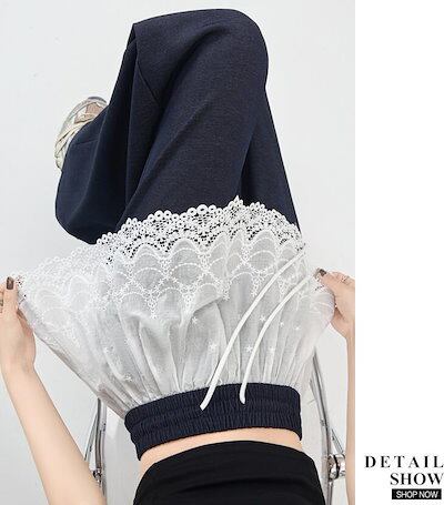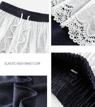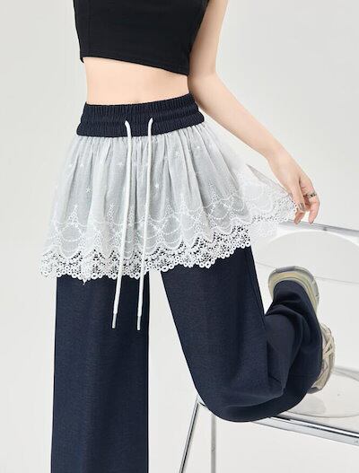 ワイドパンツ デニム レディース レース 刺繍 切替 スカート ストレートパンツ ハイウェスト ウエストレース ゴム ボトムス ゆったり 楽ちん きれいめ 春