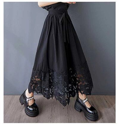 スカート 夏 レディース 裾レース ロングスカート フレアスカート Aライン 透かし ボトムス ミモレ丈 ウエストゴム きれいめ 無地 美脚 カジュアル シンプル おしゃれ 体型カバー ゆったり 大人