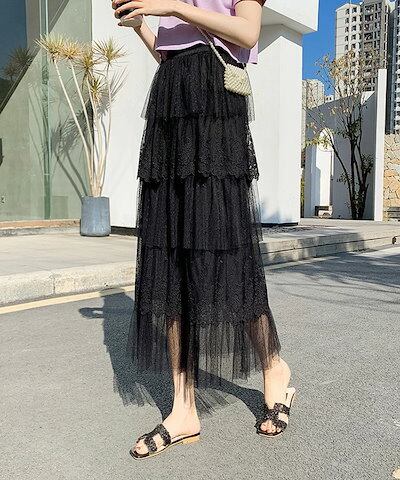 スカート レディース ティアードスカート 総レース フレアワンピース ボトムス 夏 ロングスカート Aライン ウエストゴム ミモレ丈 レース キレイめ 体型カバー お洒落 無地 ゆったり カジュアル