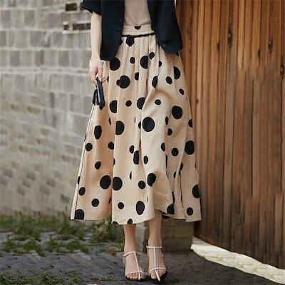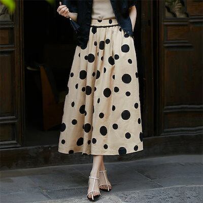 スカート ドット フレアスカート レディース ロングスカート 水玉柄 夏 スカート 綿麻風スカート ボトムス ミモレ丈 ゆったり ウエストゴム 爽やか 大人可愛い カジュアル 着痩せ 体型カバー きれ