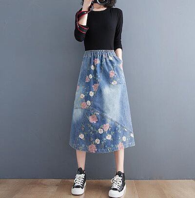 デニムスカート フレアスカート 花柄 ウエストゴム スカート デニム ダメージ ミモレ丈 ひざ丈 ロング Aライン ボトムス レディース 大きいサイズ L 2L 3