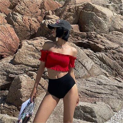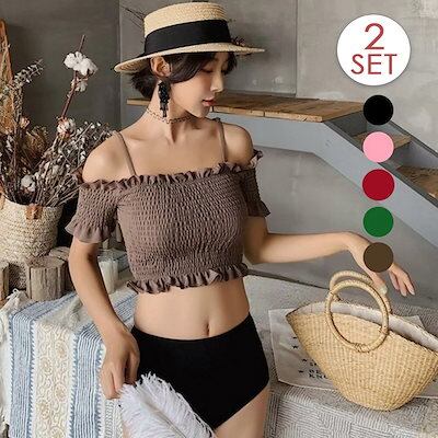 【メガ割り】水着 オフショルダー ビキニ 水着 レディース 体型カバー 二の腕カバー 2点セット セパレート ハイウエスト ワイヤー入り パッド付 小胸 バスト 盛れる おしゃれ かわいい ガーリー
