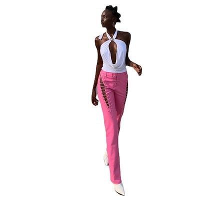 脚長効果!スキニーパンツ スラックスパンツ 個性 レザーパンツ ストレート 流行り デザイン 韓国ファッション ハイウエスト 透かし彫り ストラップデザイン