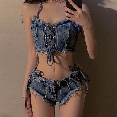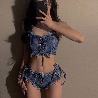 欧米 ギャル セクシー デニム ビキニ 2点セット レディース 砂浜 休暇 バンド 分体 水着