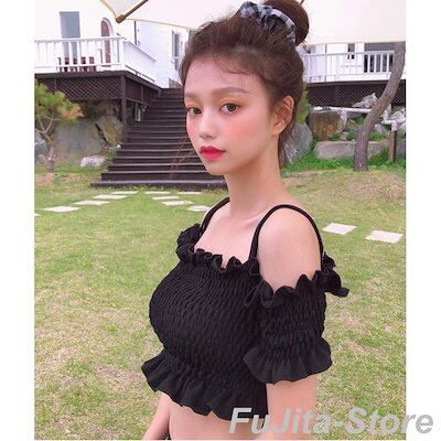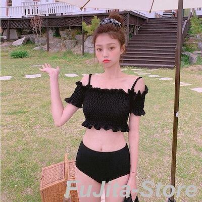水着 ビキニ スイムウェア 上下セット レディース セパレート シャーリング オフショルダー バンドゥ ハイウエスト 体型カバー 女子力アップ 肩だし