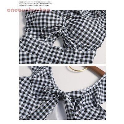 水着 レディース 体型カバー 水着ワンピース型 サロペット水着 半袖 チェック柄Vネック 小胸バンドゥ 40代 オシャレ韓国風 可愛い スイムウェア ママ