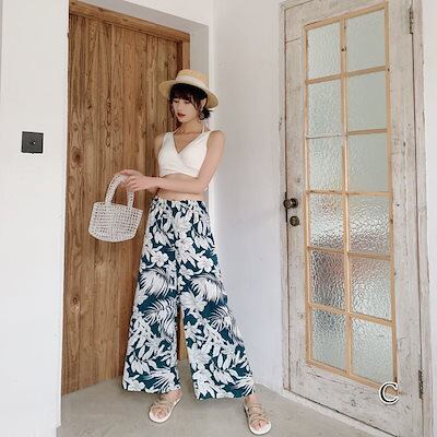 セパレート 体型カバー ボタニカル柄 グリーン ビーチ 海 温泉旅行 ピンク ママ リブビキニ Vネック レディース 水着 ブラック ショートパンツ バンドゥ ワイドパンツ おしゃれ ホルターネック