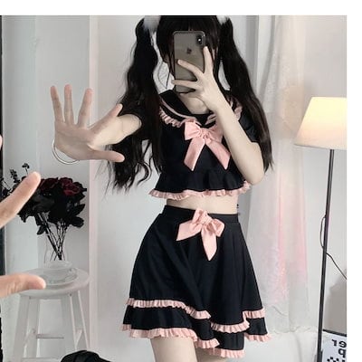 プール レディース 地雷系 バンドゥ 半袖 量産型 海 タンキニ 水遊び スイムウエア 大人可愛い ビーチ 上下セット セパレート リボン リゾート 水陸両用 ブラック 20代 フレアスカート みずぎ
