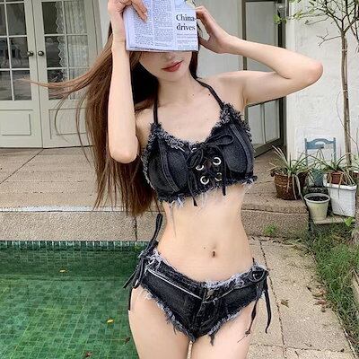 欧米 ギャル セクシー デニム ビキニ 2点セット レディース 砂浜 休暇 バンド 分体 水着