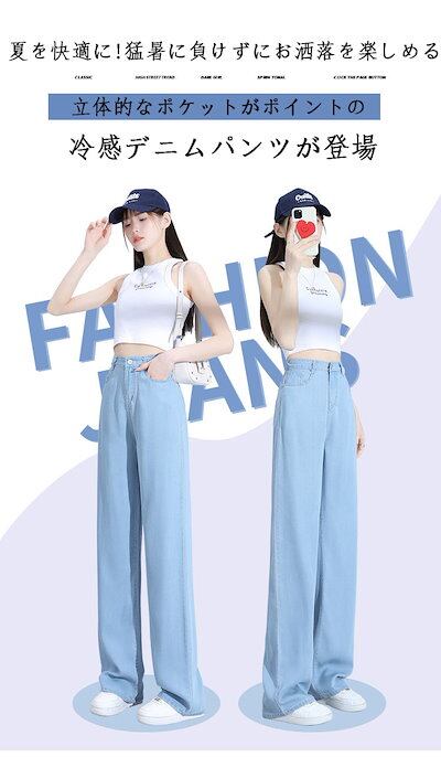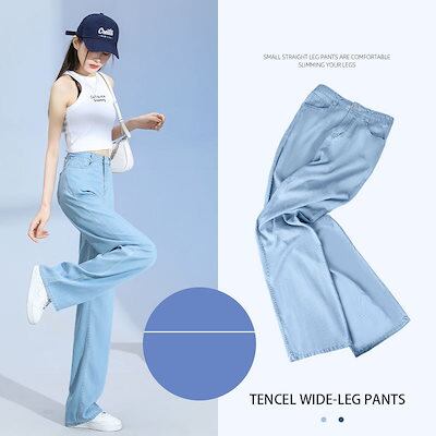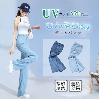 【2点で100off】シンプル デニムパンツ UVカット ハイウエスト ワイドパンツ 接触冷感 ジーンズ レディース レトロ ゆったり ワイドパンツ T