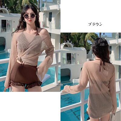 水着 レディース ビキニ ショートパンツタイプ シースルートップス フリル ブラック ホワイト ベージュ ピンク ブラウン 上下 セパレート 大きいサイズ かわいい 上下別 セット ビーチ 海 プール