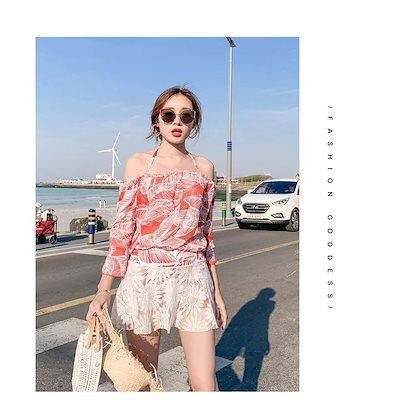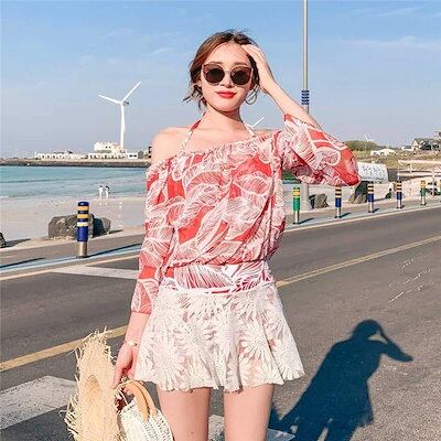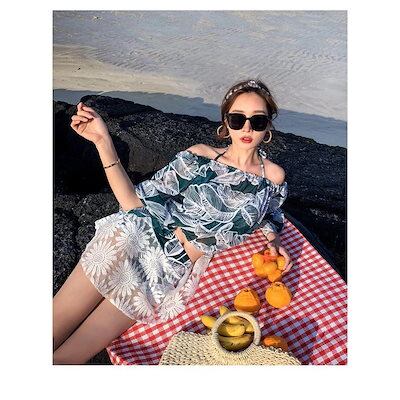 水着レディース 体型カバー 水着 ワンピース型 サロペット 肩出し 小胸バンドゥ 水着 葉柄 フリル 韓国風 40代 大きいサイズ 可愛いスイムウェア 温泉 ママ
