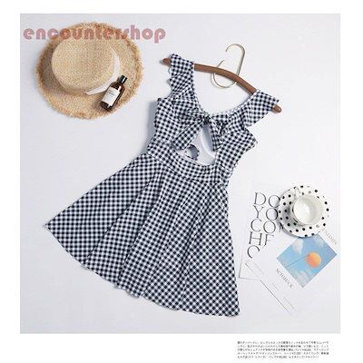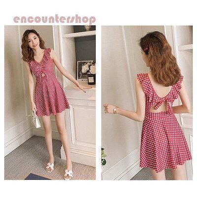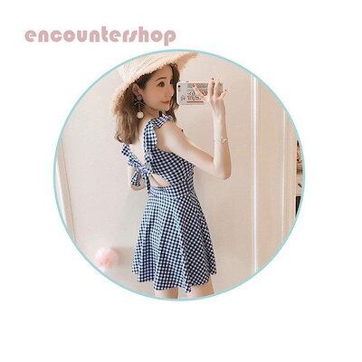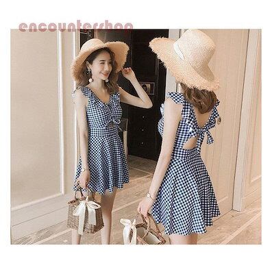 水着 レディース 体型カバー 水着ワンピース型 サロペット水着 半袖 チェック柄Vネック 小胸バンドゥ 40代 オシャレ韓国風 可愛い スイムウェア ママ