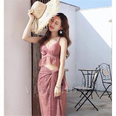 水着レディースオフショルバンドゥビキニ3点セットロングスカート付きレースアップスイムウェア体型カバーストライプ無地柄