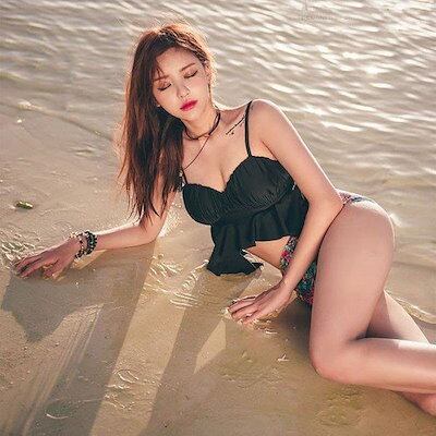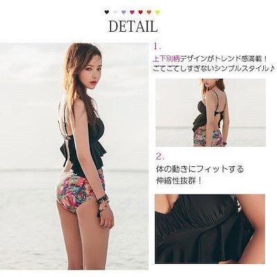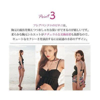 バンドゥビキニレディース水着セパレートワイヤー入り黒フリル花柄ショーツくしゅくしゅハイウ