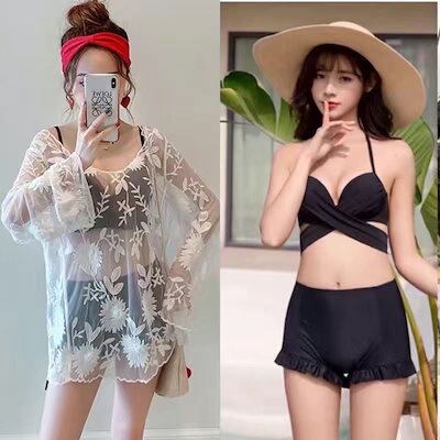 水着 韓国ファッションの水着 サマー 海辺 休暇 セクシー レディース ブラック ホワイト 2色 温泉 ビキニ 3点セット ギャザー レース ゆったり 日焼け止め水着