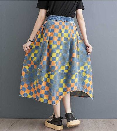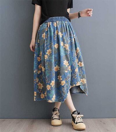 新作 デニム スカート アシンメトリー レディース ボトムス ロング デニムスカート チェック 花柄 プリント 春 夏 ウエストゴム カジュアル Aライン 着痩せ アウター お出かけ レトロ おしゃれ