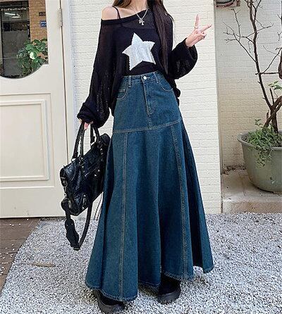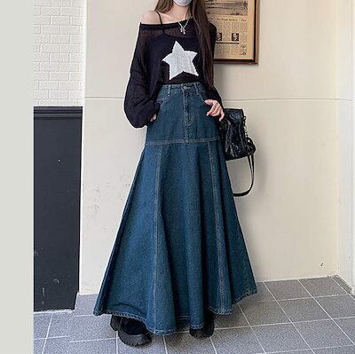 デニム スカート Aラインスカート レディース きれいめ 大人 ボトムス フレアスカート マキシ丈スカート ロングスカート 楽ちん ゆったり カジュアル お洒落 体型カバー ウエストゴム 女子会