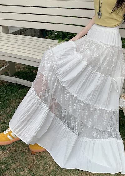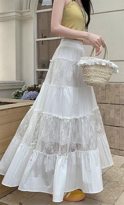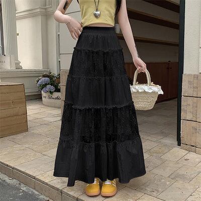 フレアスカート レディース 春 夏 スカート ロング丈 切り替え レース 刺繍 ウエストゴム ボトムス 異素材 ロングスカート 透け感 裏地付き マキシ丈 薄手 ふんわり ボリューム セレモニ