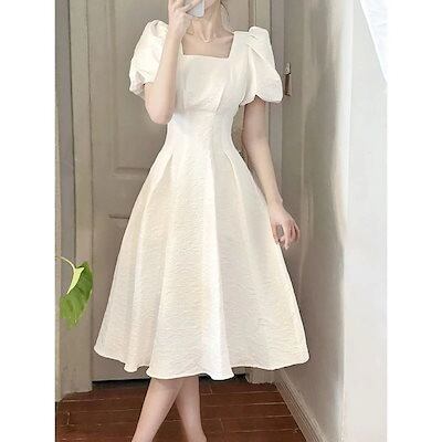 愛されドッキングワンピースフランス初恋白ビッグスイングロングスカートレディーススクエアカラーウエスト着痩せワンピース