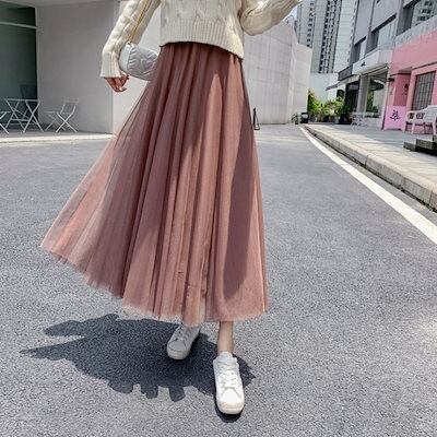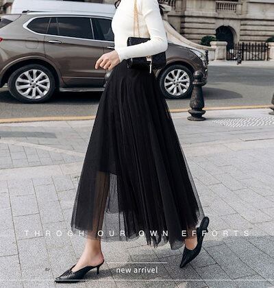 プリーツスカート レディース ロングスカート チュール ロング丈 ミモレ丈 ウエストゴム レース 伸縮性 きれいめ 大人 おしゃれ クール エレガント 存在感 春 夏 デート お出かけ 休日 旅行