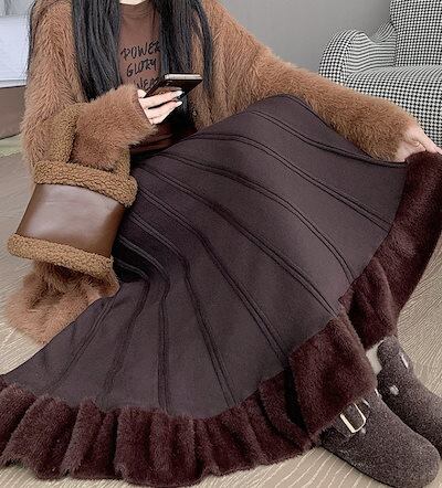 ニットスカート レディース スカート ロングスカート プリーツスカート ミモレ丈 ロング 裾ボアフリル ハイウエスト ウエストゴム リブニット 伸縮性 厚手 きれいめ 大人 おしゃれ 大人女子