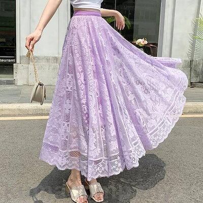 スカート ボトムス レース エレガント レディース きれいめ カジュアル おしゃれ ロング丈 大人 可愛い フェミニン Aライン 体型カバー ウエストゴム ナチュラル ベージュ パープル ブラウン ホ
