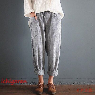 【即納】サルエルパンツ レディース ロング丈 ボトムス テーパードパンツ チノパン ロングパンツ パンツ ゆったり コットン リネン 綿麻 ストライプ 薄手 春 夏 秋