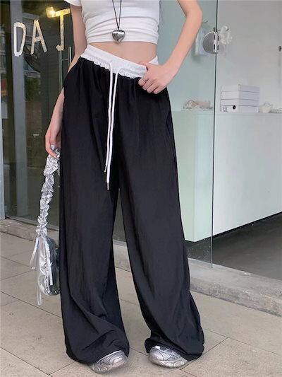 2025 春夏パンツ モップパンツ ロング丈 ワイド ハイウエスト 美脚効果 脚長効果 細見え 夏 青 黒 おしゃれ かわいい 韓国ファッション レディース お出かけ