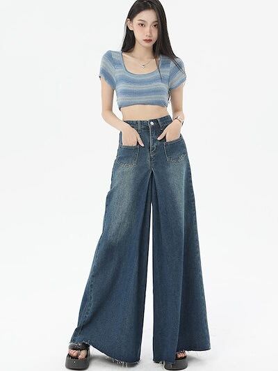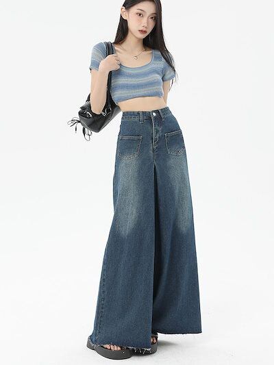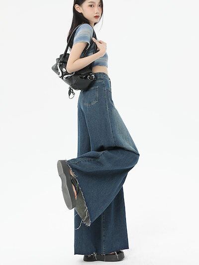 ワイドパンツ ロングズボン 長ズボン ハイウェストゆったり デザイン感 レディース服 ロングパンツ ジーンズ 着痩せ レディースレトロ切りっぱなし ワイドパンツ